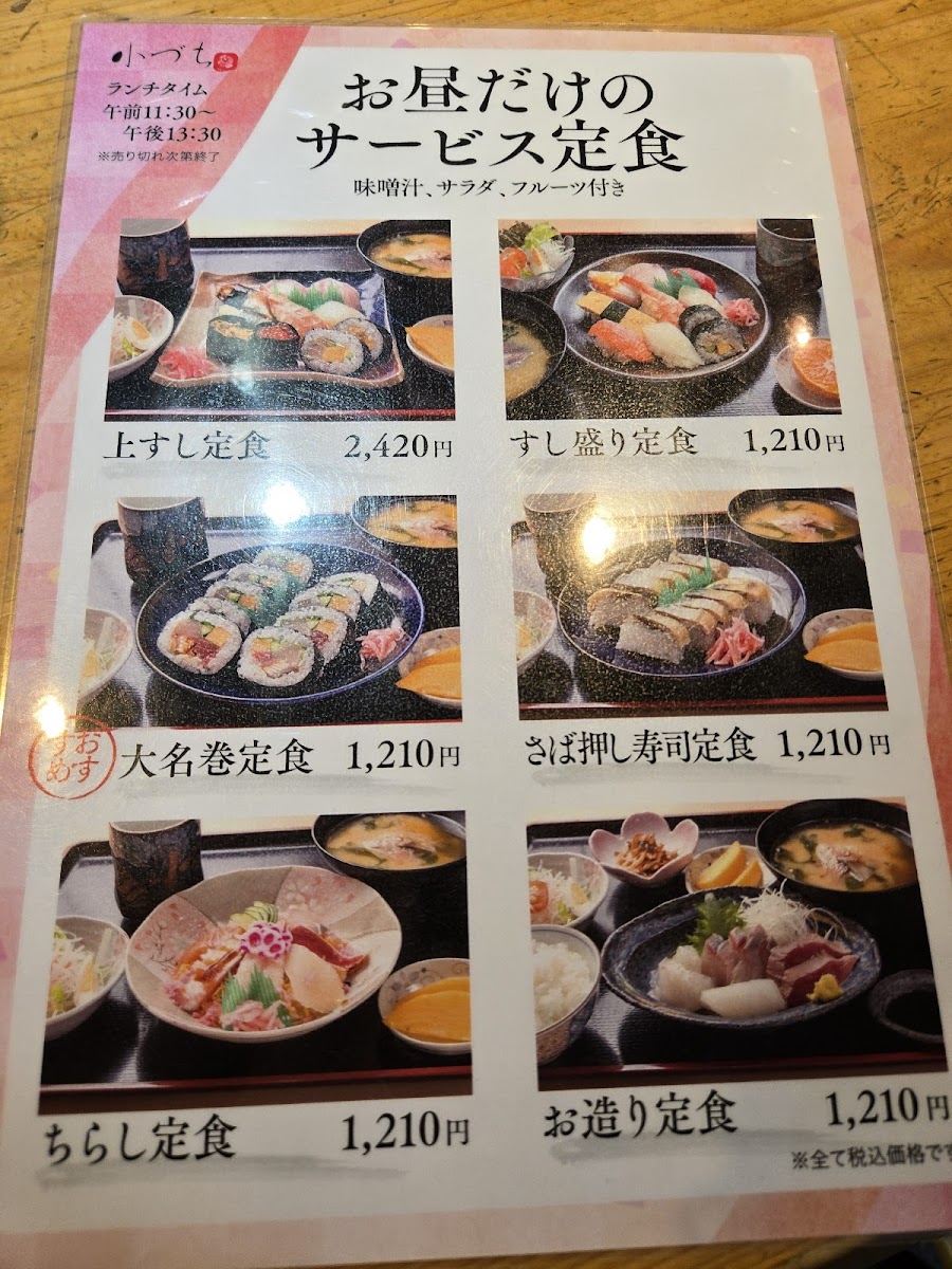 From a reviewer’s perspective, the menu at Kozuchi Sushi offers a well-balanced selection that highlights both freshness and variety, making it easy to enjoy a satisfying traditional meal. The sushi options are particularly appealing, with the 握り寿司盛り合わせ and 中にぎり providing a reliable assortment of fresh fish and well-formed rice that showcase the chef’s skill. Set meals such as the 太巻き定食 and お造り定食 are excellent choices for those who want a more complete dining experience, combining sushi or sashimi with comforting sides like みそ汁 and the small appetizer おとうし, which add depth to the meal without overwhelming the main dishes. For lighter options, rolls like サラダ巻 offer a refreshing contrast, while the classic tuna roll 鉄火巻き delivers a simple but satisfying flavor. Overall, the menu feels thoughtfully composed, offering both traditional favorites and balanced set meals that make Kozuchi Sushi a dependable place for a relaxed and authentic sushi dining experience.
